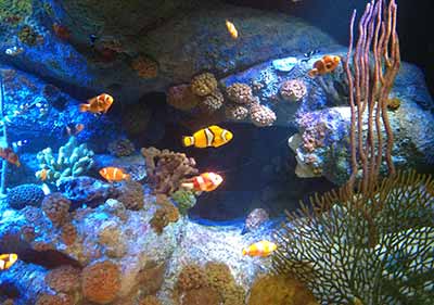 Other tanks house fish as moray eel, scorpion fish, sea horses, tang fish with their very bright colors as yellow and blue and the colorful clownfish as well as beautiful corals. Don’t miss the giant crab and the lively Asian small clawed otters, the smallest otter species in the world.